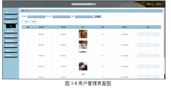 用户管理,在用户管理页面可以对索引,用户账号,用户姓名,照片,性别,联系方式等内容进行详情,修改和删除等操作,如图5-8所示。