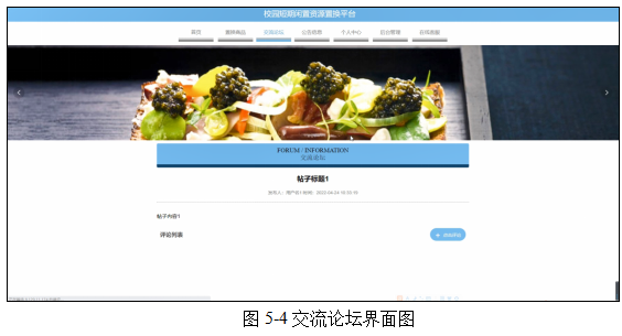 交流论坛,在交流论坛页面可以查看帖子标题,发布人,发布时间,帖子内容等信息并进行评论操作,如图5-4所示。