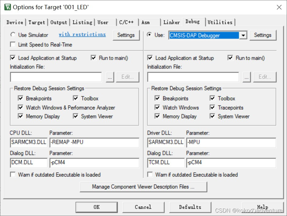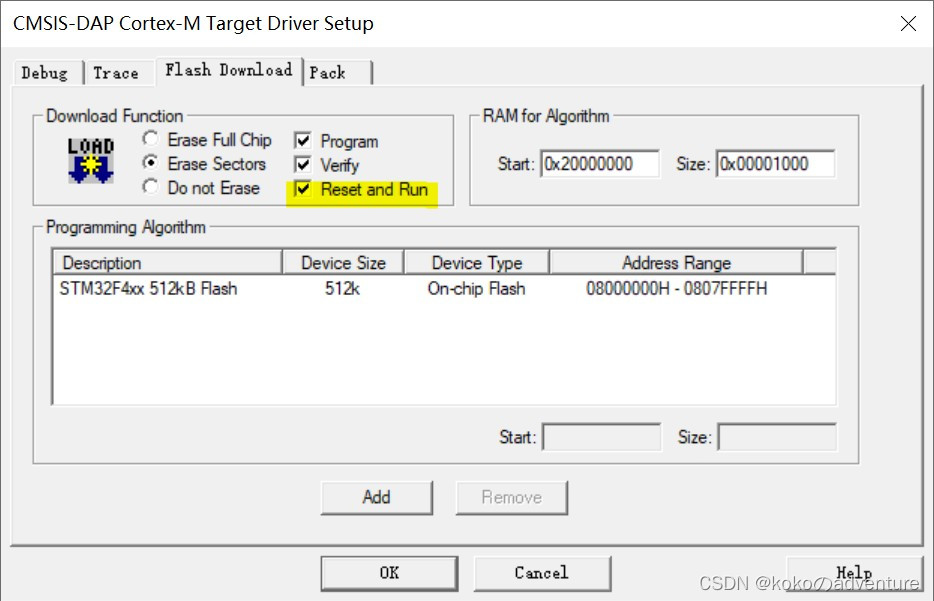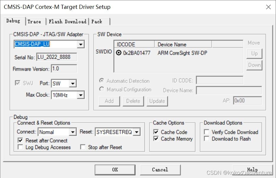 下载模式配置:DAPLINK选Serial Wire(如果不进行配置进行一次下载后,再一次下程序可能就下不进去)。