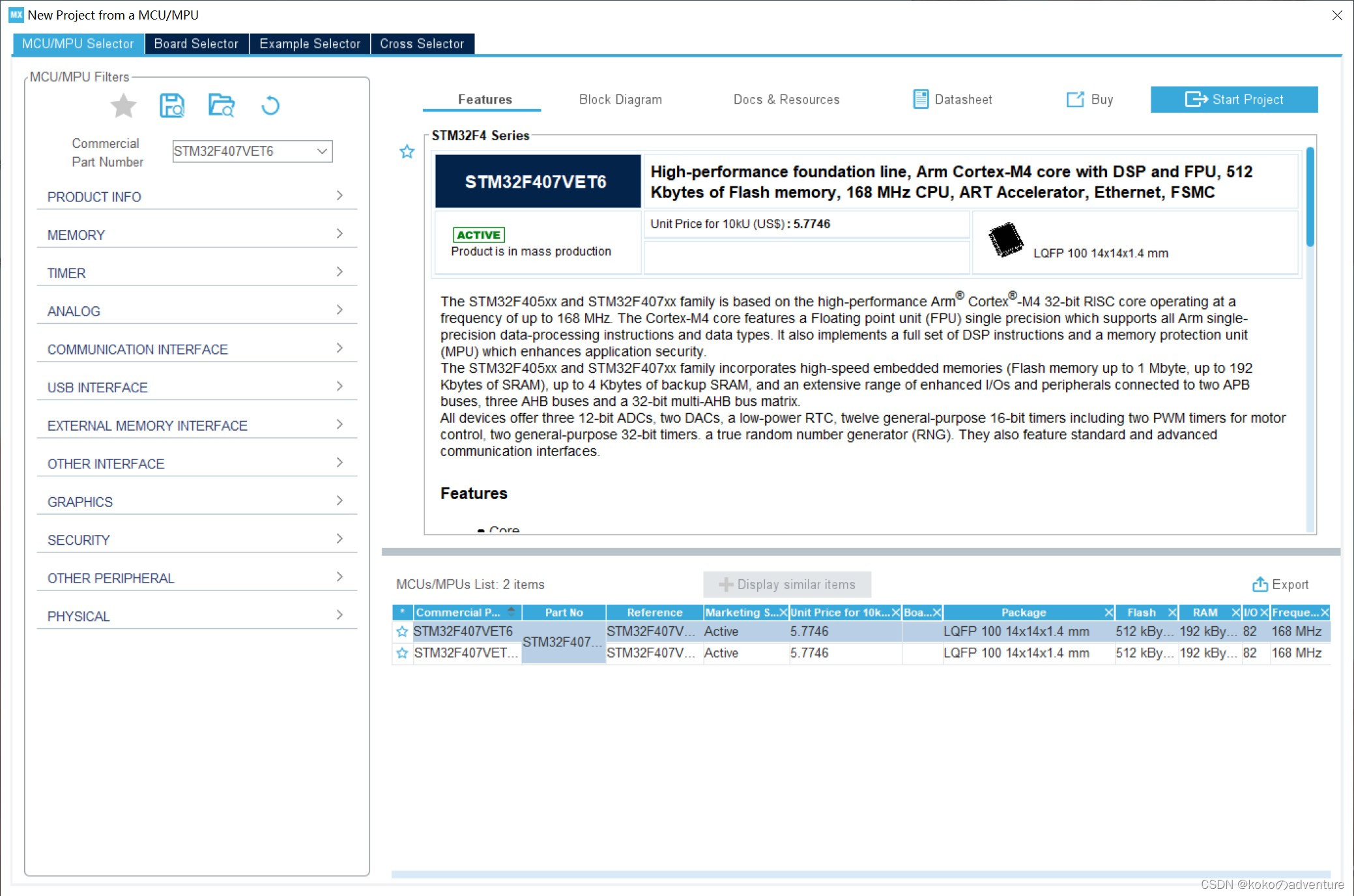 打开STM32CubeMX,打开MCU SELECTOR,搜索并选中芯片STM32F407VET6: