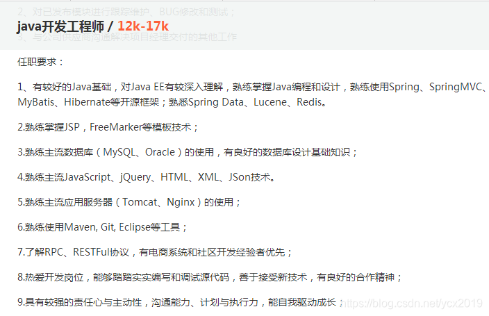 今天我们聊一下大家都关心的问题,Java自学应该如何去找工作。那么首先你就要明确现在招聘Java开发的基本要求是什么?下面我们来看一下招聘网站上面的要求,在这里我只随便找了一个比较全面的要求,自己可以去拉勾网去调查一下。
