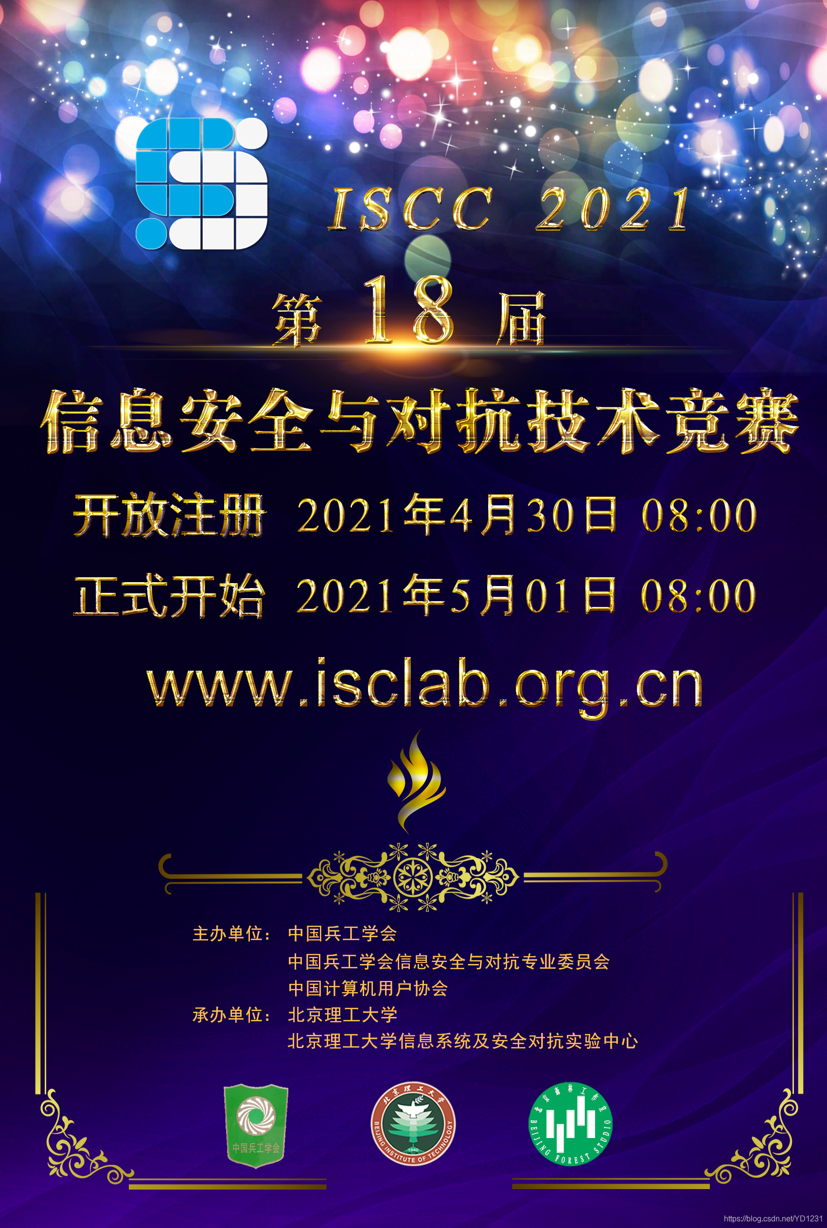 ISCC是Information Security and Countermeasures Contest(信息安全与对抗技术竞赛)的缩写,每年举办1届,2004年举办第1届竞赛,2021年为第18届竞赛。ISCC由北京理工大学罗森林教授提出,最早由北京理工大学教务处主办,而后由教务处、网络中心、团委共同主办。截止目前已有多家主办、协办和支持单位,其宗旨是面向广大民众:提升信息安全意识,普及信息安全知识,实践信息安全技术,共创信息安全环境,发现信息安全人才。