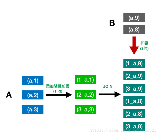 实现原理:对造成倾斜key所在的A表的每条数据都打上1~n的随机前缀,对另一个正常的B表进行n倍扩容,每条数据都打上一个1-n的前缀,然后进行join