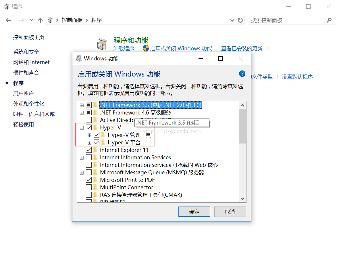 依次打开控制面板-程序-启用或关闭Windows功能,勾选Hyper-V
