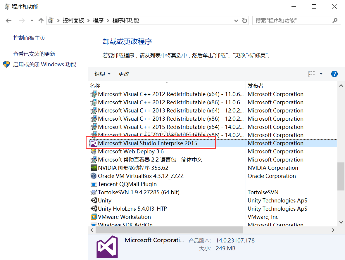 第一步自行下载安装,第二步位置依次打开控制面板-程序-程序和功能,看到程序列表了吗?找到Microsoft Visual Studio Enterprise 2015,右键更改。