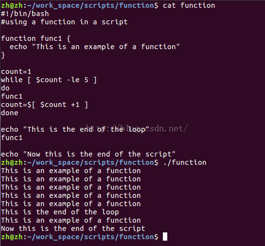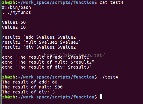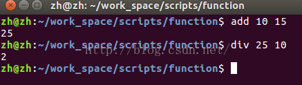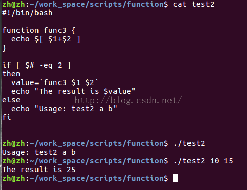 函数可以使用标准的参数环境变量来代表命令行上传给函数的参数,如,函数名会在$0变量中定义,函数命令行的任何参数都会通过$1, $2等定义。也可以用特殊变量$#来判断传给函数的参数数目 ,函数可以用参数环境变量获得参数值。