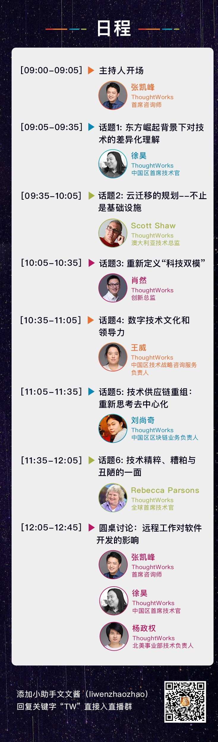 除了这三大趋势,大会上还将会涉及到数字化转型下的组织文化、领导力的转型难点、“科技双模”全新科技应用模式的解读、去中心化的技术生态的建立、技术安全合规的相关技巧的讲解。在7月23日9点开始的Thoughtworks雷达峰会2020的直播上,大会讲师将会以理论结合实际的方式,为大家进行讲解。详细议程见下图,现在扫描二维码或者点击阅读原文,限时免费报名,大家抓紧时间千万不要错过!