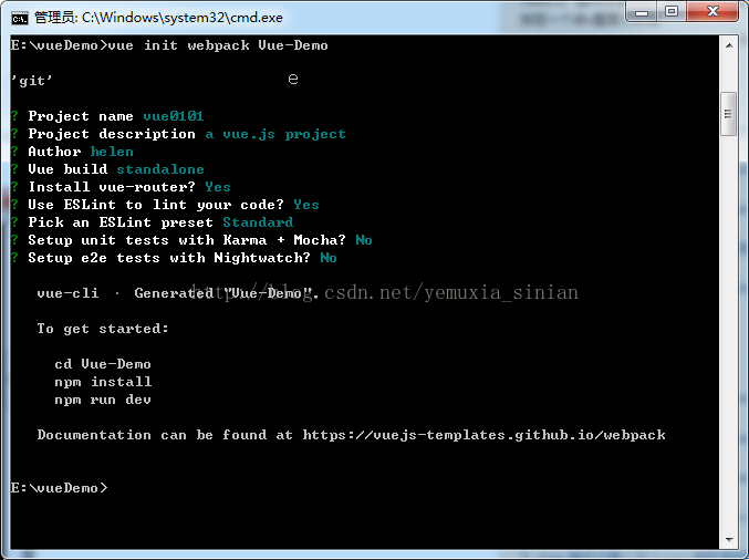 其中webpack是模板名称,可以到vue.js的GitHub上查看更多的模板https://github.com/vuejs-templates