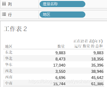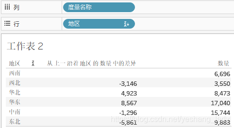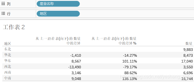 从图中可以看出,西北【数量】-西南【数量】=-3146。依次类推。同时,如果表中【地区】中各个地区的排序发生变动,对应的差异数据会重新计算。注意,使用 分析-查看数据 看到的数据的排序与直接中画图区看到的不一样。所以这里在画图区展示的数据(用 文本表 展示数据,即可看到数据计算过程)。