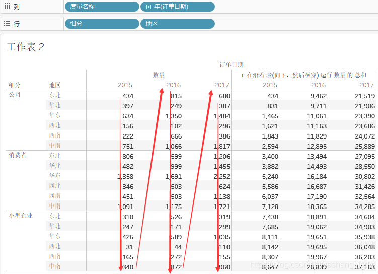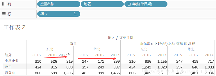 如果单元格中有多个数字时可以使用单元格表计算。如下图,每个单元格内有三个数字(只不过这三个数字是以图形的方式显示的),使用“合计百分比”表计算可以同时计算各个地区各个年度的客户销售额占比。