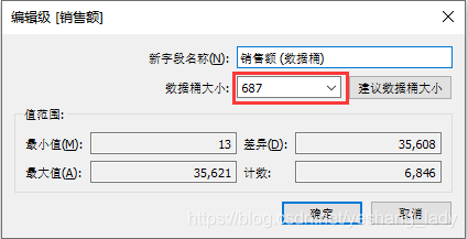 通过数据桶可以将连续型变量离散化。仍然以Tablueau中的自带的【超市】数据为例,在【销售额】字段上创建数据桶,右键点击【销售额】->【创建】->【数据桶】,打开如下编辑框: