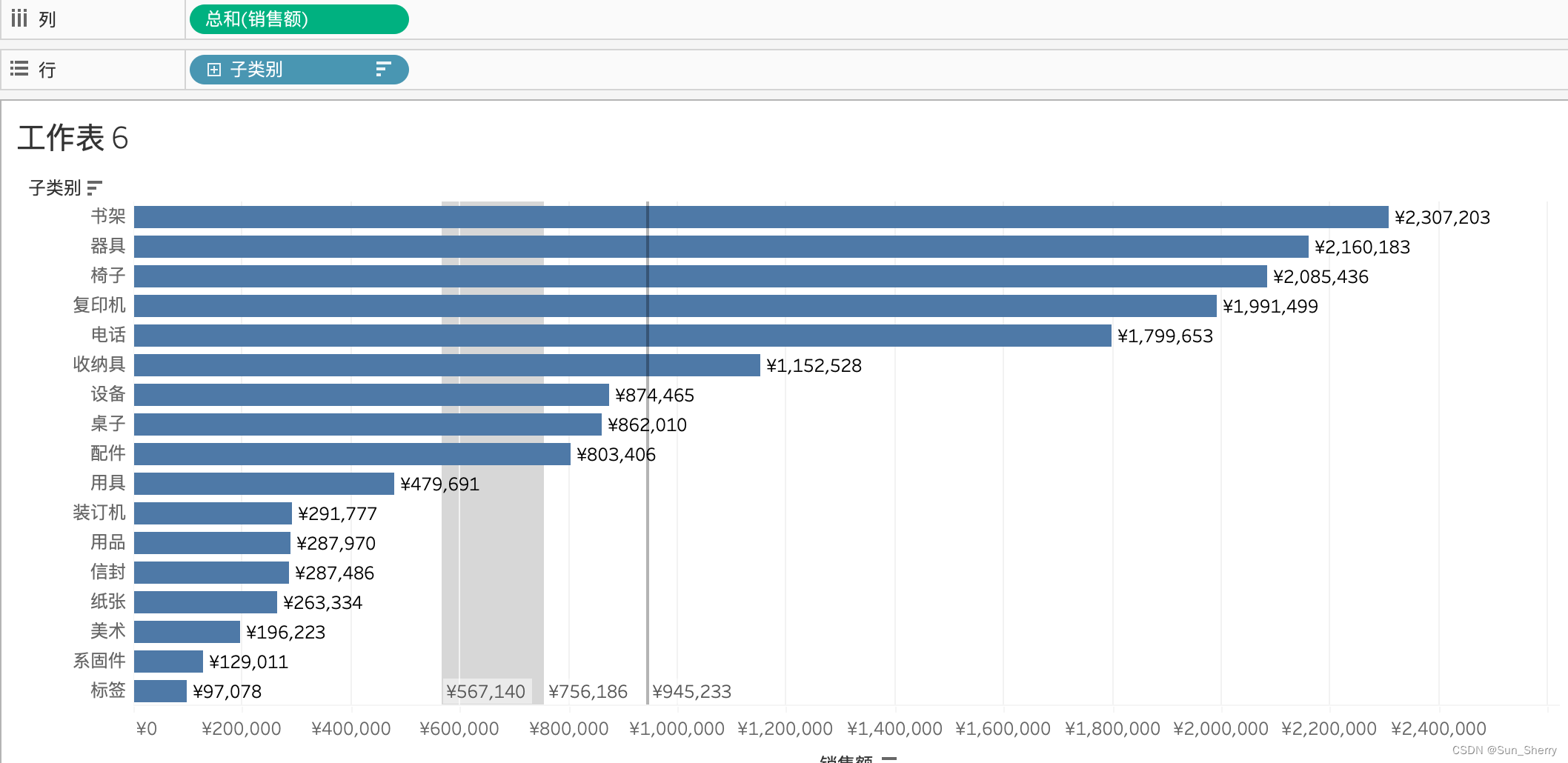 这里参考线的计算数据为工作表中各个子类别的销售额总和(下同)。 - 标签:主要用来指定参考线的标签形式。