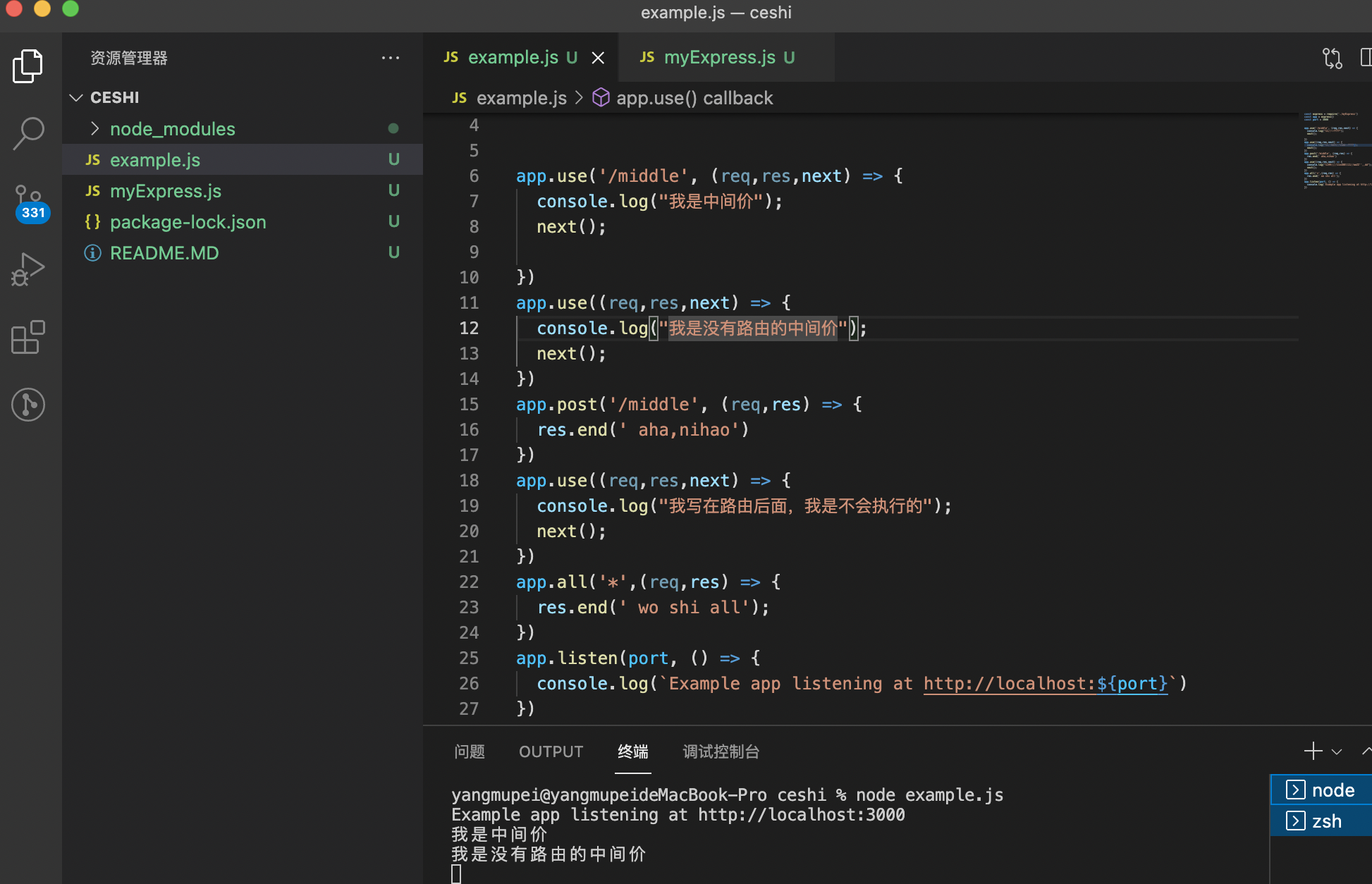对了,使用中间件的时候,最后要执行next(),才能交给下一个中间件或者路由执行。