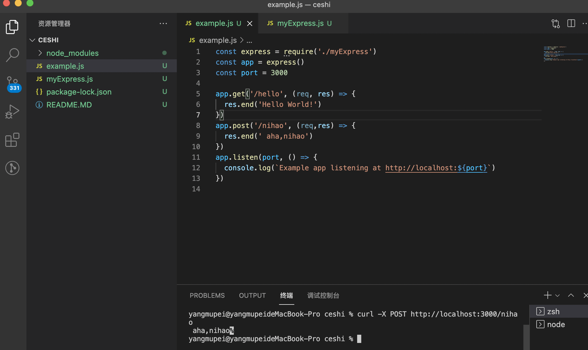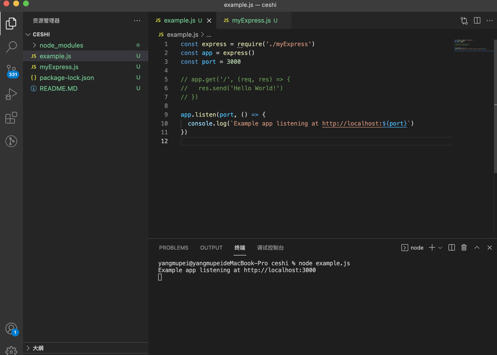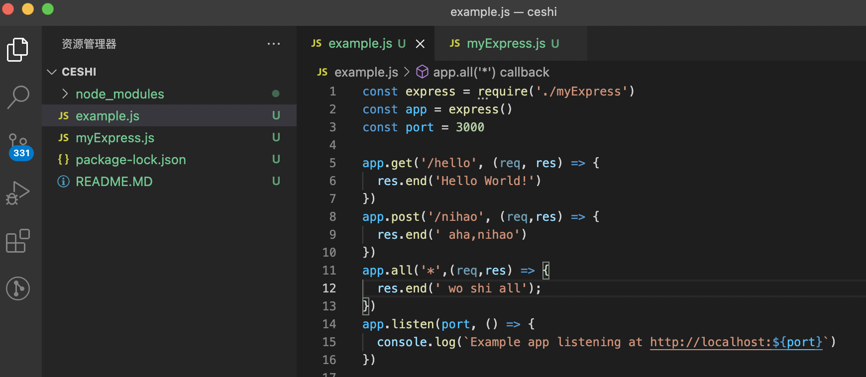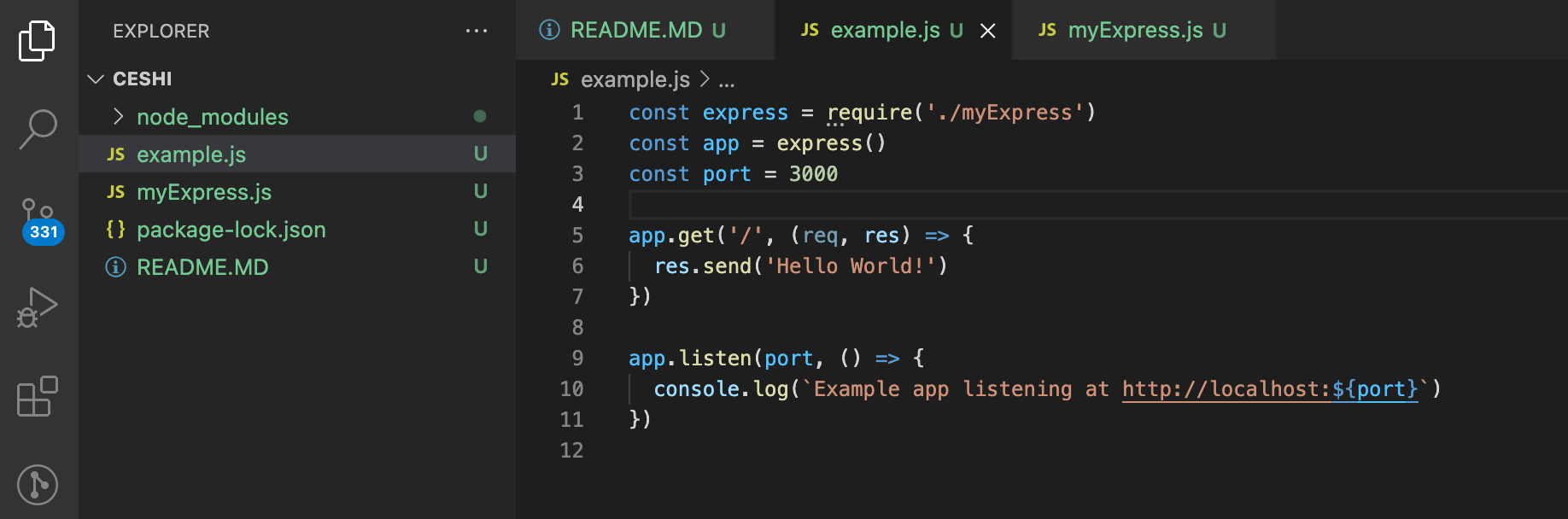 如下图所示,现在我们决定创建一个属于我们的express文件,引入的express改成引入我们手写的express。