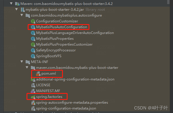 基于springBoot的starter机制能够让我们在使用外部包时候非常方便,只需要引入该组件提供的starter包即可,比如在pom中引入mybatis的mybatis-plus-boot-starter依赖包,那么springboot启动时候会自动扫描所有的依赖该包下META-INF文件夹下的spring.factories把自动配置类加入容器: