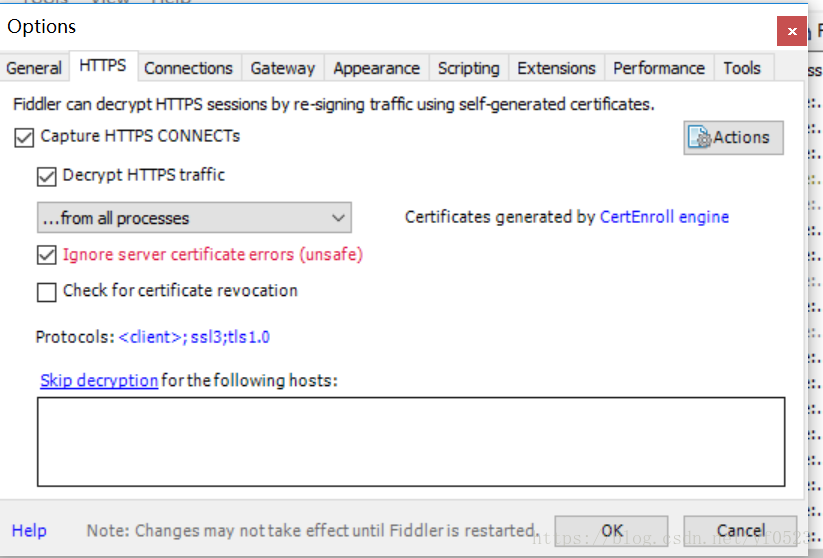 再点击https,设置HTTPS,该选项是为了设置抓https协议的包,到此fiddler设置完成,关闭重启。