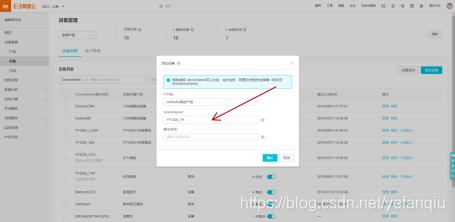 b.单击添加设备。选中上一步创建的产品,输入设备名称