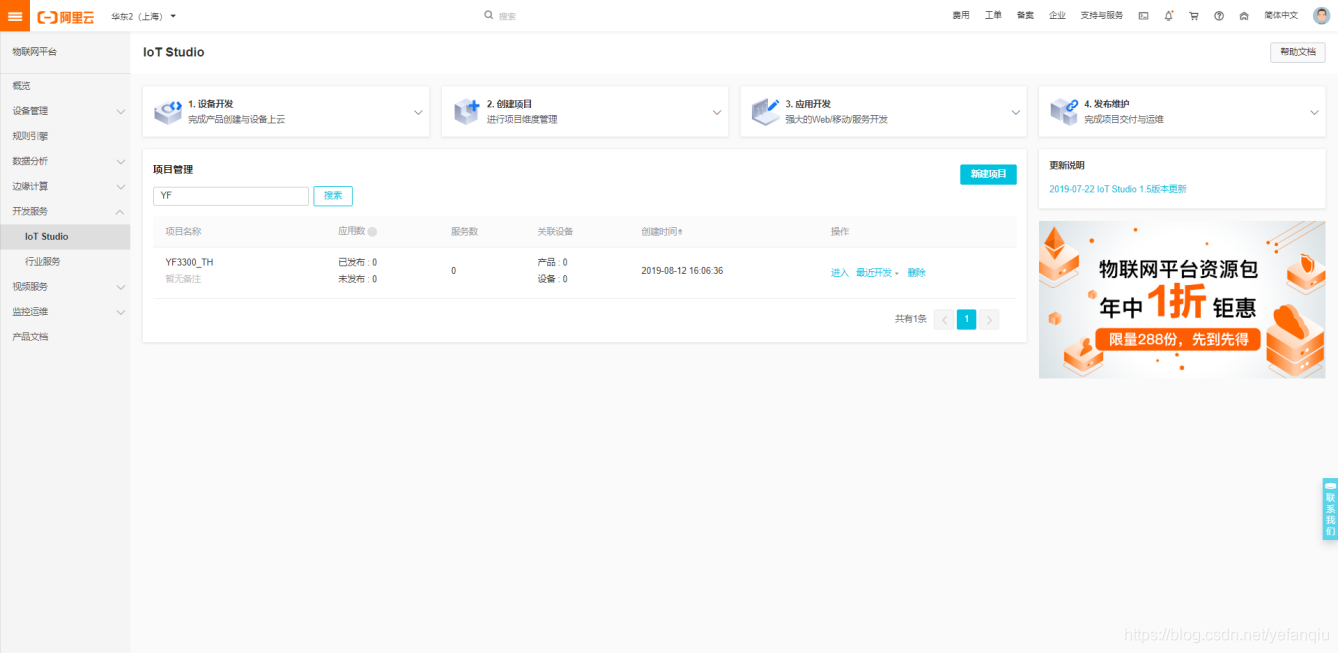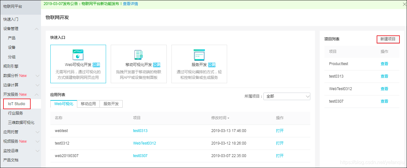 (1)在物联网平台控制台左侧导航栏,点击开发服务>IotStudio