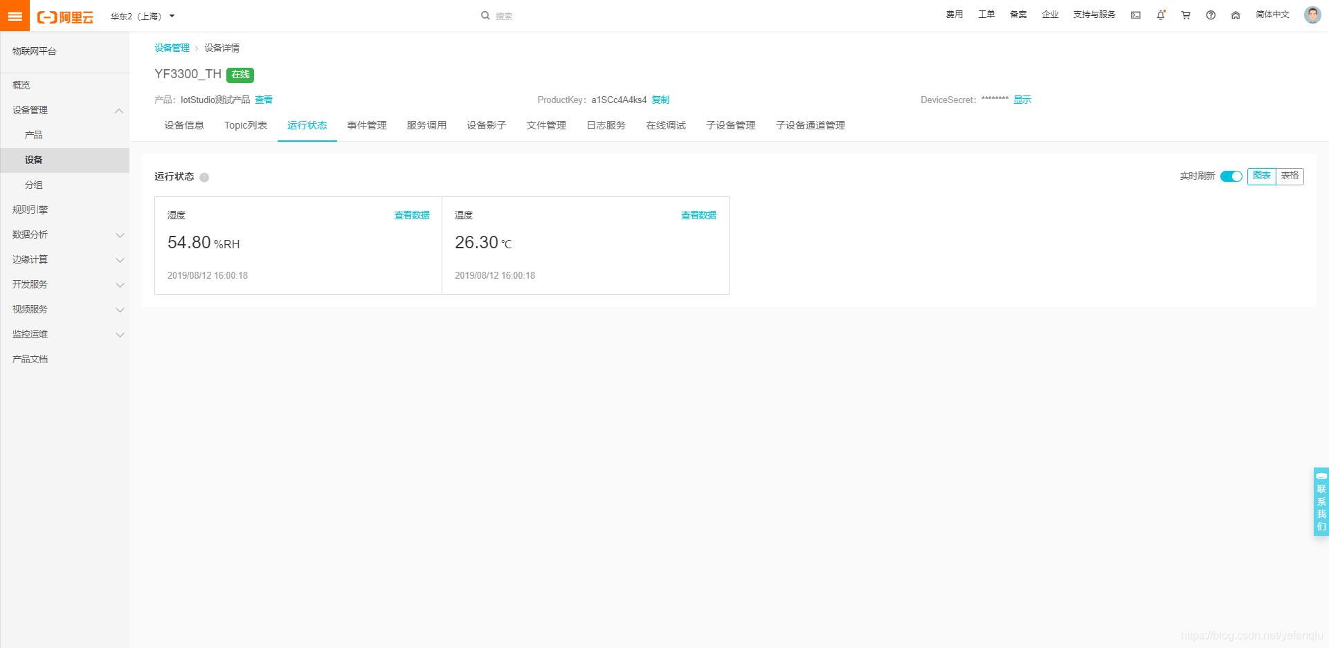 (6) 查看云端设备情况 设备为在线状态温度湿度实时显示