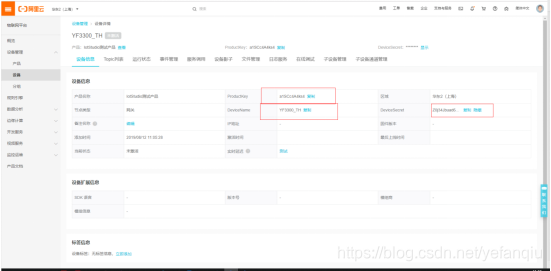 设备证书包含ProductKey、DeviceName和DeviceSecret。设备证书是设备后续与物联网平台交流的重要凭证,请妥善保管。