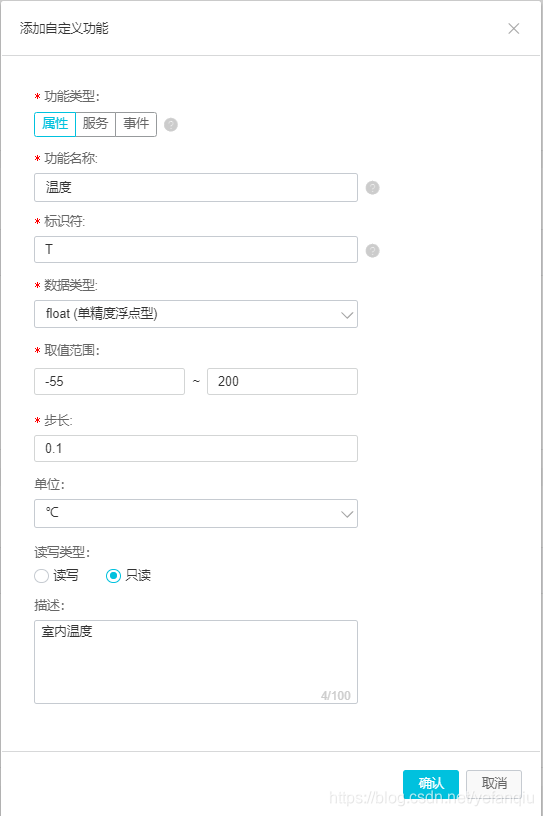 a.在创建的产品界面选择功能定义 > 自定义功能>添加功能。创建温湿度属性