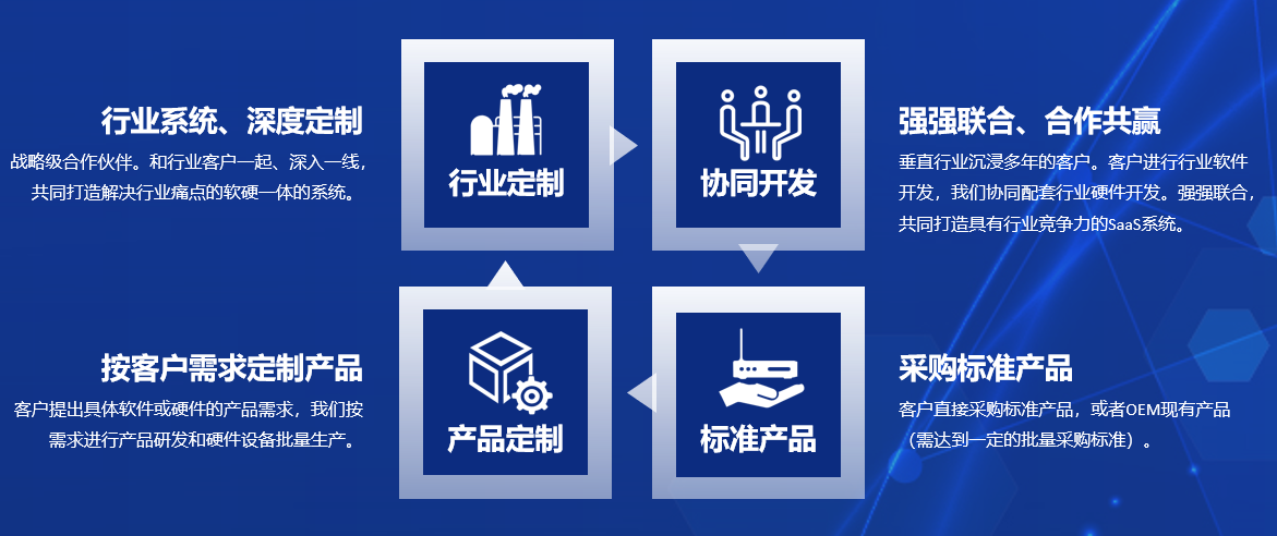叶帆科技公司和各个垂直领域的企业合作模式主要有四种:行业定制、协同开发、产品定制和标准产品。其中前两种是我们尤为看重的模式,因为只有这两种模式,才能真正的和合作企业彼此信任,深入合作,才能真正共同打造出有竞争力的产品和系统。