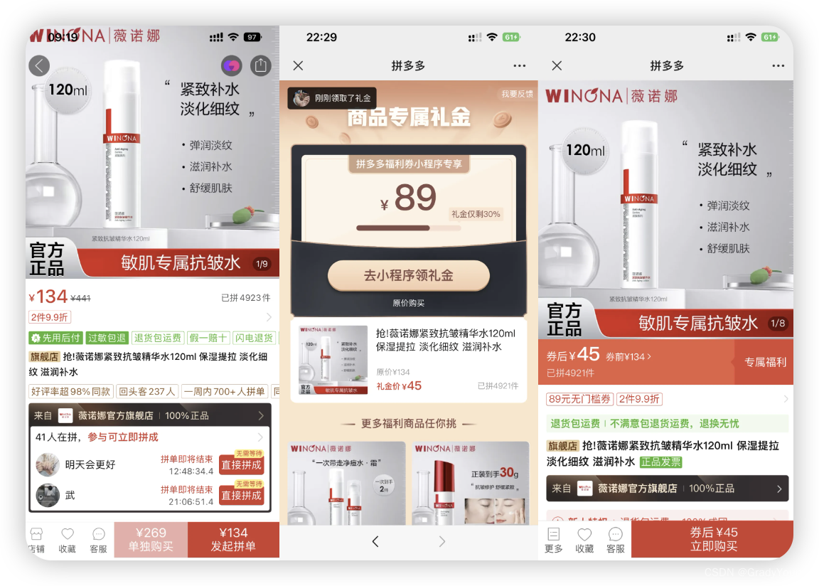 拼多多薅羊毛攻略教程!省钱购物不求人! 大家好!给大家分享一个拼多多薅羊毛领券的详细攻略教程,教你如何轻松地在拼多多上省钱购物!你们平时在拼多多购物的时候,忽略了寻找优惠券。其实优惠券也是有名堂的,就比如下面我要给大家分享的,只有在「惠集省」小程序里面,才可以领取到的「拼多多小程序专享福利券」。就以下面这个商品为例吧:第一张图片为你们平时进入拼多多看到的价格「¥134」;第二张图片为使用惠集省领到的专属优惠券礼金「¥89」;第三张图片为领券后价格「¥45」。