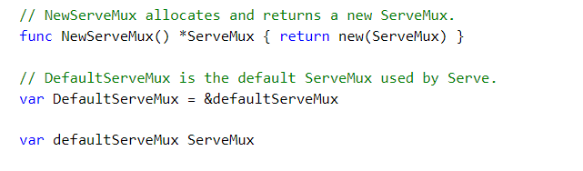 DefaultServeMux其实就是http内部定义的ServeMux类型数据的内存地址,在上面的源码中可以看到,调用http.NewServeMux()方法就能创建ServeMux数据。