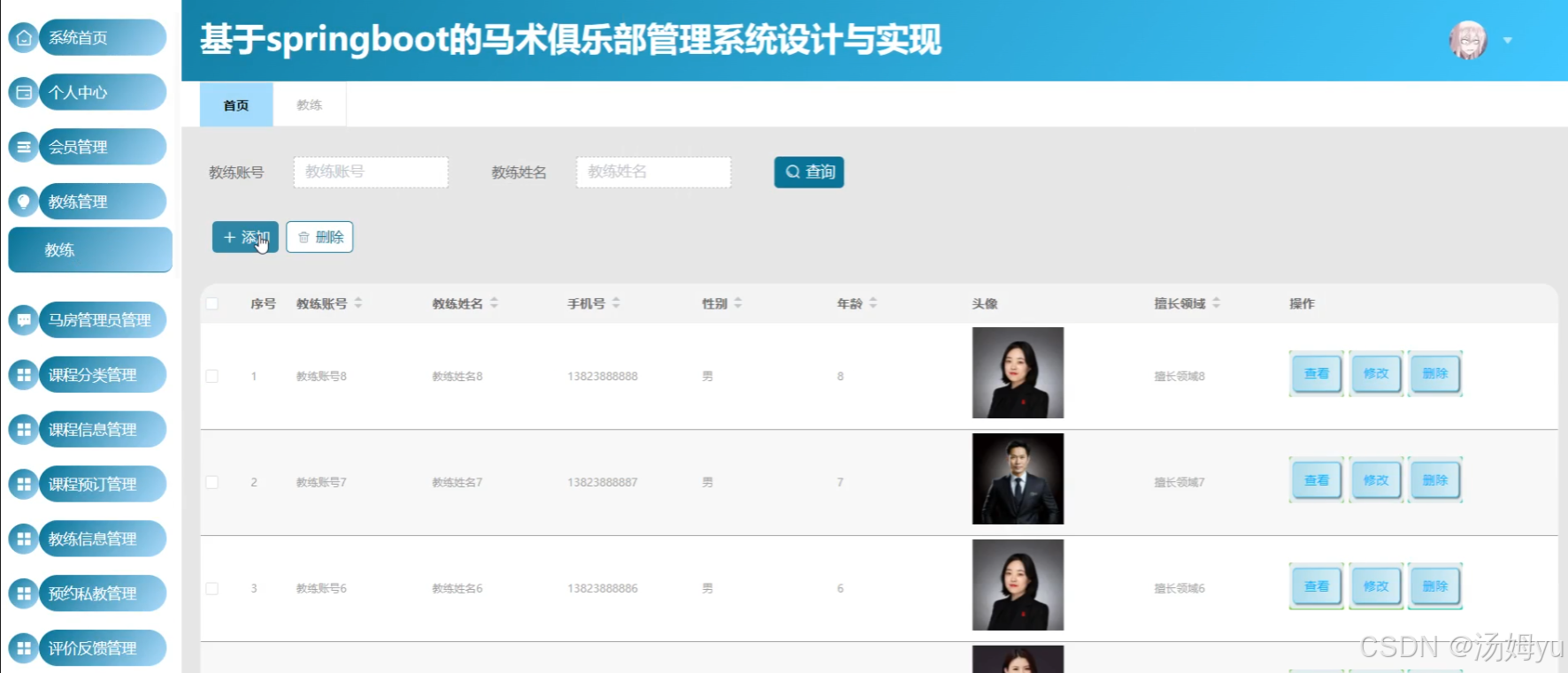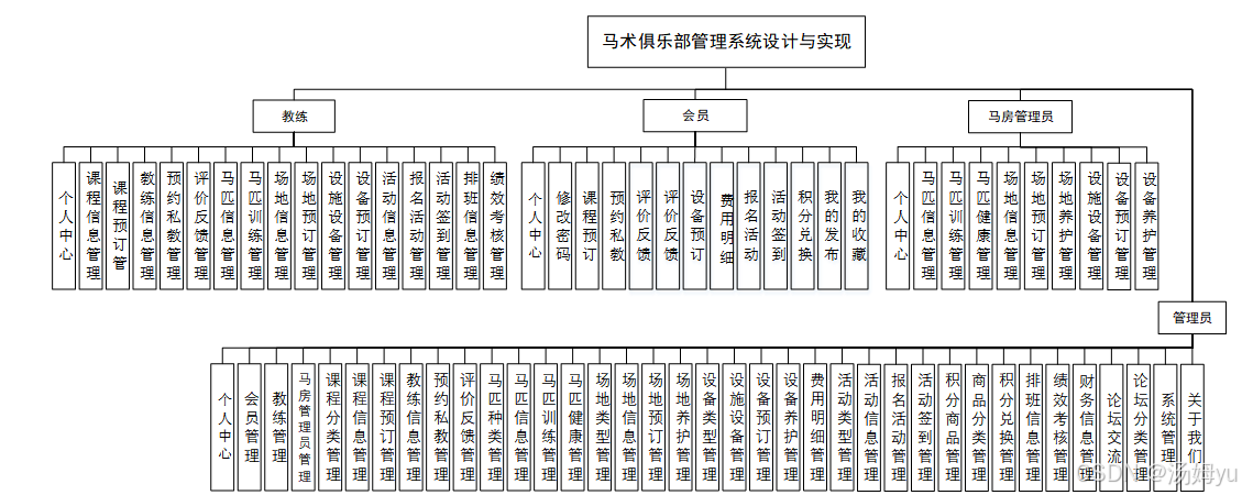 马术俱乐部管理系统的研究主要着眼于提升俱乐部的管理效率和服务质量,通过集成化的信息平台实现对俱乐部运营的全方位管理。系统的核心功能覆盖了会员管理、教练管理、马房管理员管理等关键领域,旨在为俱乐部提供一套完整的人员信息管理解决方案。通过课程分类管理、课程信息管理以及课程预订管理,系统能够优化课程安排和会员预订流程,提高课程的可访问性和满意度。教练信息管理和预约私教管理功能则为会员提供了更加个性化的教练服务体验。评价反馈管理功能使俱乐部能够及时收集和响应会员的反馈,不断改进服务质量。马匹种类管理、马匹信息管理、马匹训练管理和马匹健康管理功能则涵盖了马匹全生命周期的管理,确保马匹福利和训练效果。场地类型管理、场地信息管理、场地预订管理和场地养护管理功能则为俱乐部场地的高效利用和维护提供了支持。设备类型管理、设施设备管理、设备预订管理和设备养护管理功能则关注于俱乐部设施设备的维护和使用效率。费用明细管理、活动类型管理、活动信息管理、报名活动管理和活动签到管理功能则为俱乐部的财务管理和活动组织提供了便利。积分商品管理、商品分类管理、积分兑换管理以及排班信息管理功能则进一步增强了会员的参与度和满意度。绩效考核管理和财务信息管理功能为俱乐部的内部管理和决策提供了数据支持。论坛交流、论坛分类管理和系统管理功能则为俱乐部构建了一个开放的沟通平台,促进了会员之间的交流和社区建设。整体而言,马术俱乐部管理系统的研究意在通过技术手段,实现俱乐部管理的现代化,提升服务水平,增强会员体验,从而推动俱乐部的长期发展和行业竞争力。