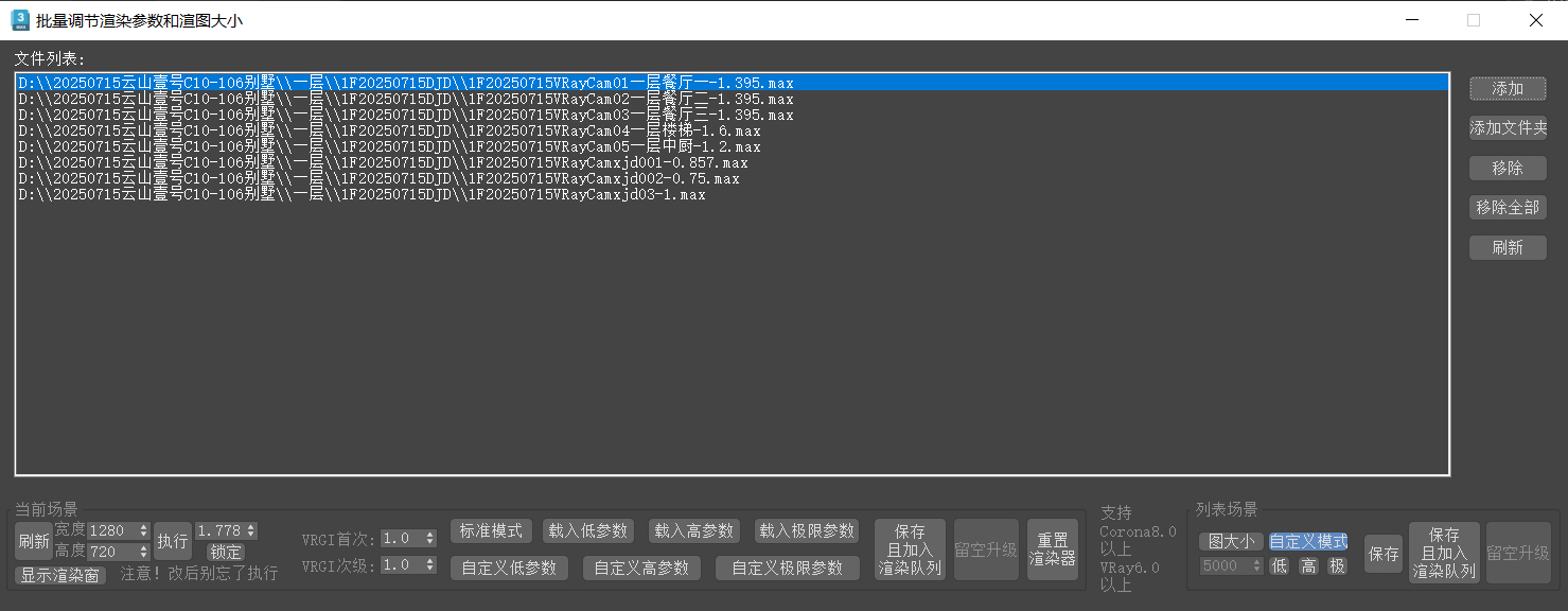 此插件能对多个文件修改其渲图输出大小,还有渲图的高低参数,还可以自定义自己的渲图高低参数。