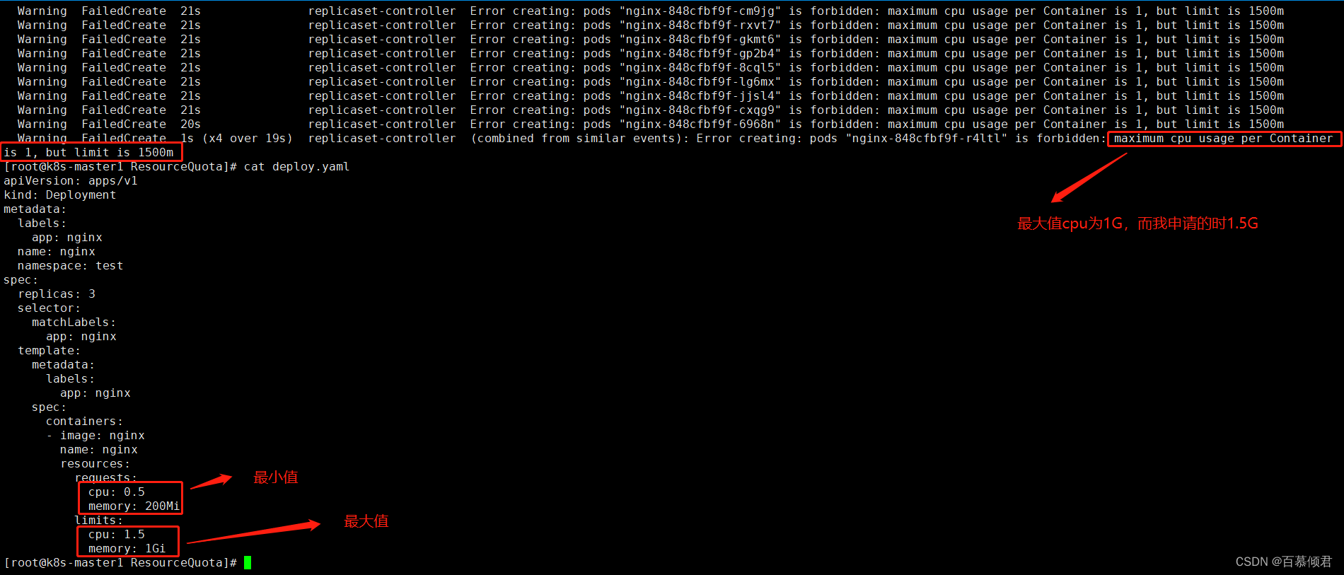 3.创建的pod申请最小cpu资源低于设置值,会创建失败,限制成功。