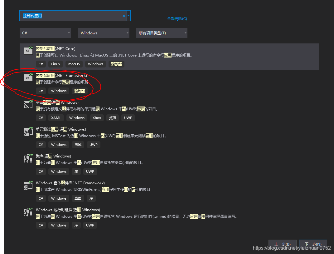我以往在创建c#项目时,都会选择“控制台程序(.NET Core)”,但这样后面会出现问题,无法添加LINQ to SQL类。创建项目时一定要选择.Net Framework下的控制台应用程序(选择“控制台应用(.NET Framework)"),这样后面才可以添加"LINQ to SQL类"新建项。这个我也不知道为什么,可能.NET Core支持的LINQ to SQL需要另一套操作方法,如果有人知道,欢迎评论区告诉我。