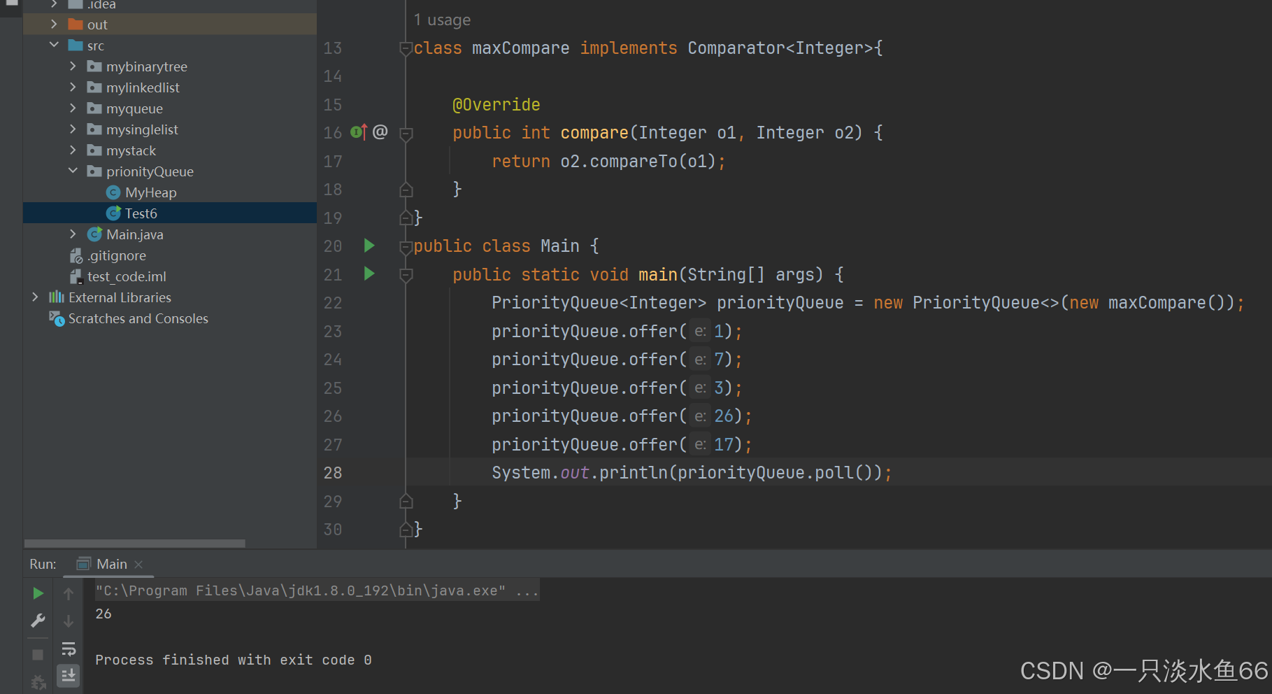 我们发现在弹出堆顶元素的时候,这个数是堆中最大的元素,也就是说我们成功的创建了一个大根堆的PriorityQueue(优先级队列)