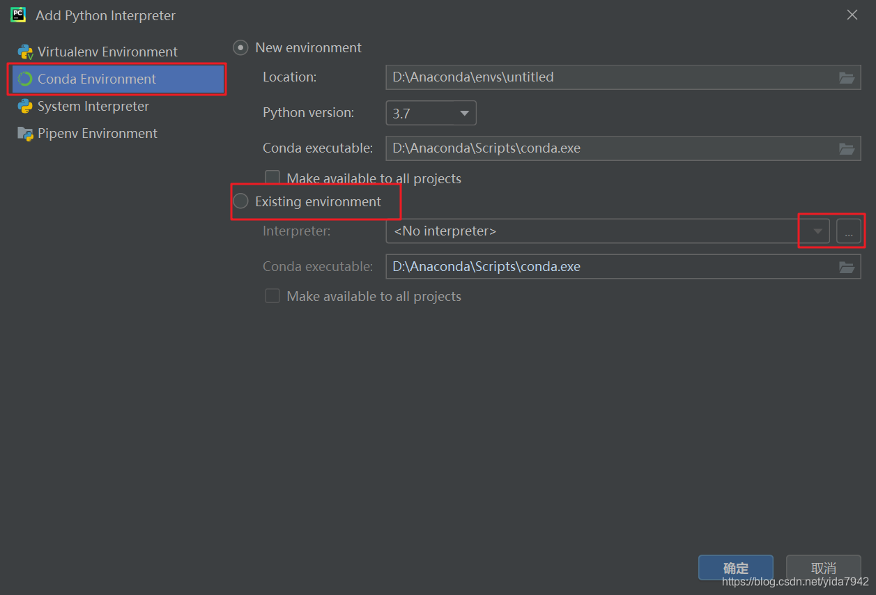 选择‘Conda Environment’,选择已存在环境,并设置interpreter;