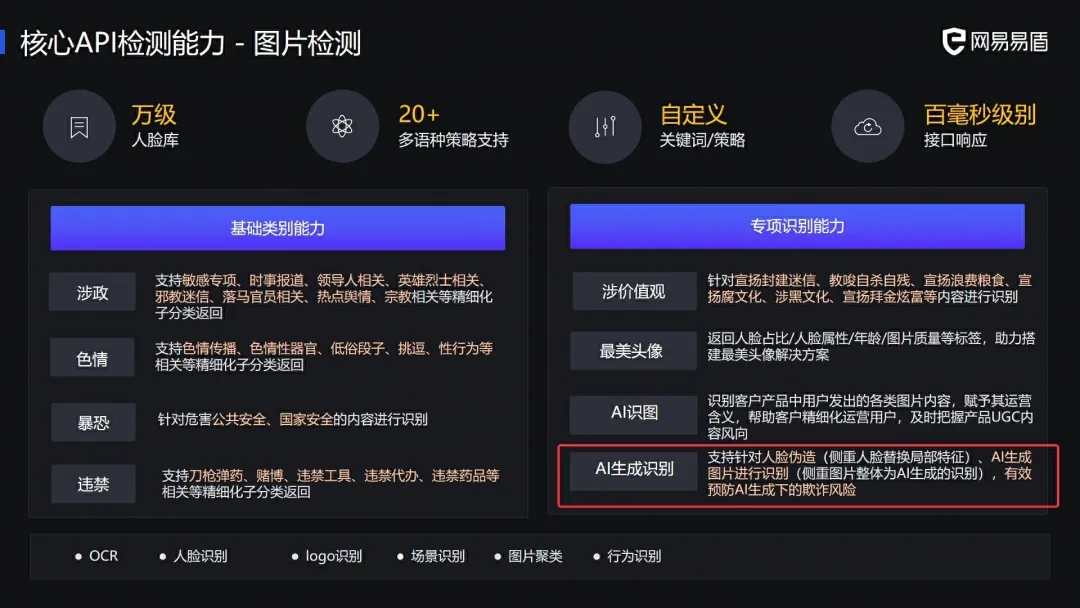 针对本次事件提到的深度合成内容问题,易盾推出专项识别能力“AI生成识别”,支持针对人脸伪造(侧重人脸替换局部特征)、AI生成图片识别(侧重图片整体为AI生成的识别),有效帮助用户预防AI生成下的欺诈风险。