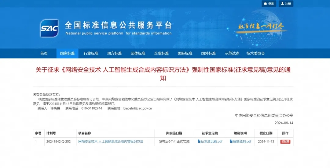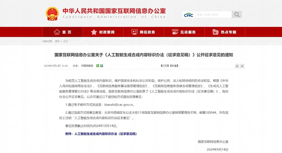 在《实践指南》对外发布一年之际,国家互联网信息办公室在2024年9月14日连发2条重要通知,《人工智能生成合成内容标识办法(征求意见稿)》(以下简称《办法》)、《网络安全技术 人工智能生成合成内容标识方法》强制性国家标准(征求意见稿)(以下简称《方法》)同时对外征求意见。《办法》和《方法》分别从法律法规、强制国家标准层面,丰富完善了内容标识的相关要求。