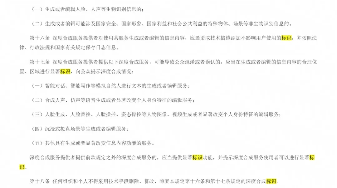 基于此,国家相关部门做出迅速反应,《互联网信息服务深度合成管理规定》《生成式人工智能服务管理暂行办法》等一系列法规相继落地,对AI生成内容做了细致规定。比如《互联网信息服务深度合成管理规定》侧重四个方向:深度合成技术研发前需通过伦理评估、深度合成技术的非法应用禁止、确保深度合成技术使用的非误导性、内容平台内容审核与假消息筛查义务。其中确保深度合成技术使用的非误导性,就明确了“生成式内容标识”相关细节。