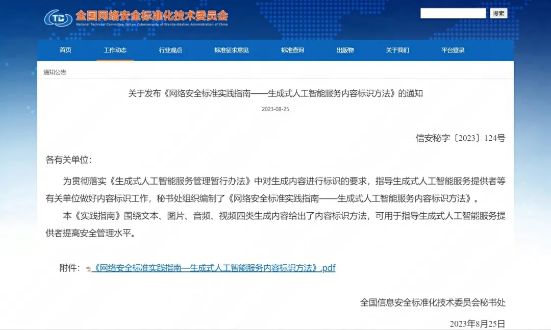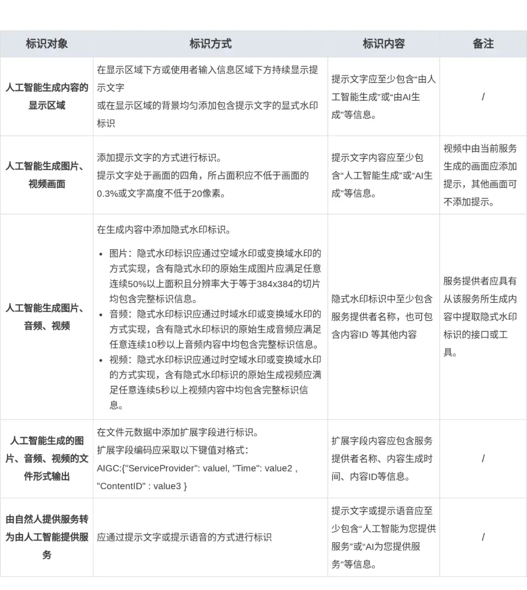 为配合前述法规的落地实行,在具体标识方法上,TC260全国网安标委于当年配套发布了的《网络安全标准实践指南——生成式人工智能服务内容标识方法》(以下简称《实践指南》)。该《实践指南》明确了文本、图片、音频、视频等四类生成内容的标识方法,包括显式水印、隐式水印等标识方式,以及标识信息的其他具体要求。该《实践指南》为后续的“内容标识”专项法规及强制国家标准奠定了基础。