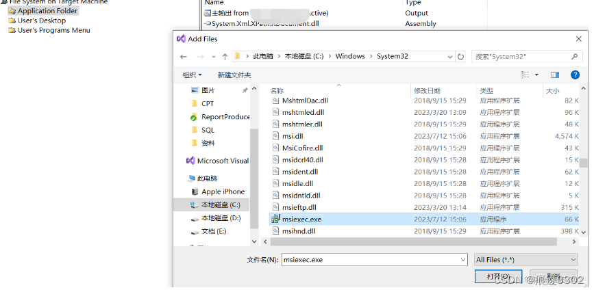 5、创建卸载程序 右键Application Folder >点击 Add>点击文件>在C盘中搜索 msiexec.exe 文件 选择C:\Windows\System32 中的msiexec.exe
