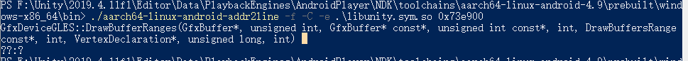 之后启动windows命令行工具,输入./aarch64-linux-android-addr2line -f -C -e .\libunity.sym.so 0x73e900