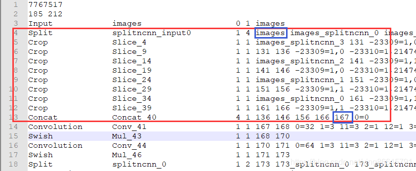 修改前, 从Split层到下面的Concat层 这10层是yolov5的focus层, ncnn目前不支持这样, 需要写一个自定义的YoloV5Focus层来代替这10层, 注意我这里层的输入blob名字是images, 输出blob名字是167. 不同网络的blob也不一样: