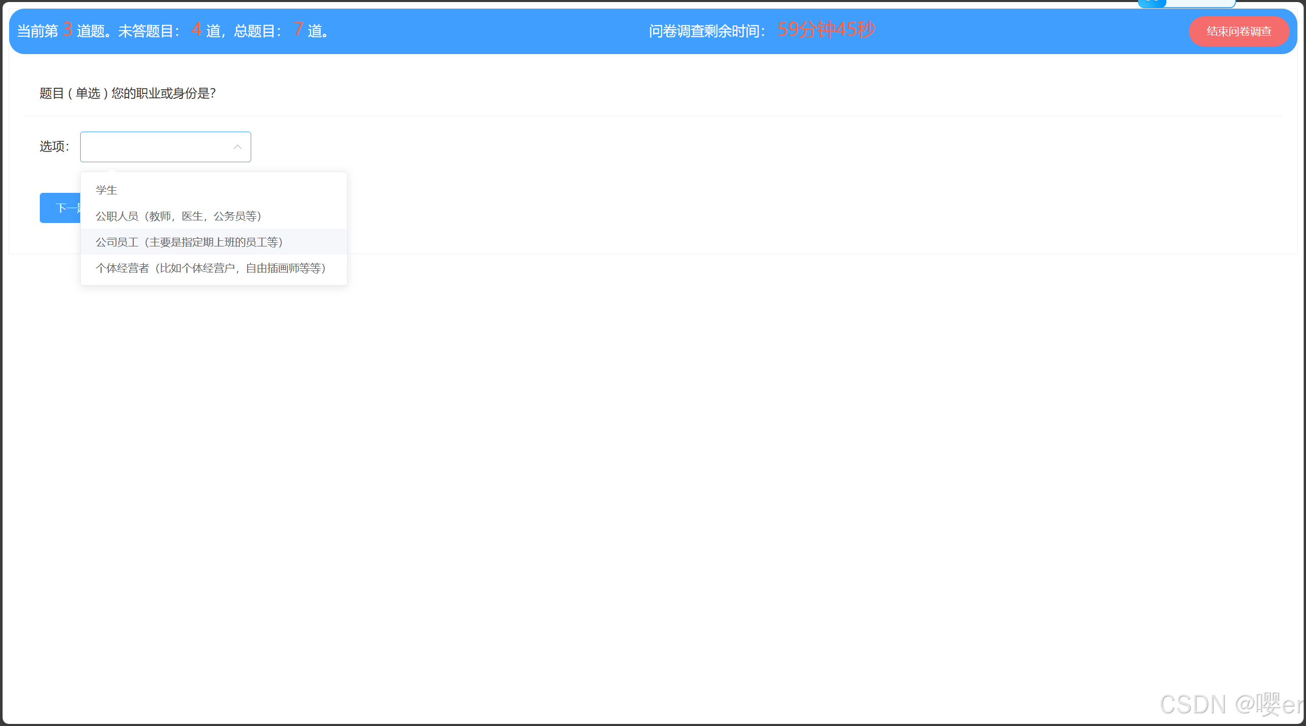 学生可以参与问卷调查,管理员可以创建和管理问卷及问题,支持多种题型。