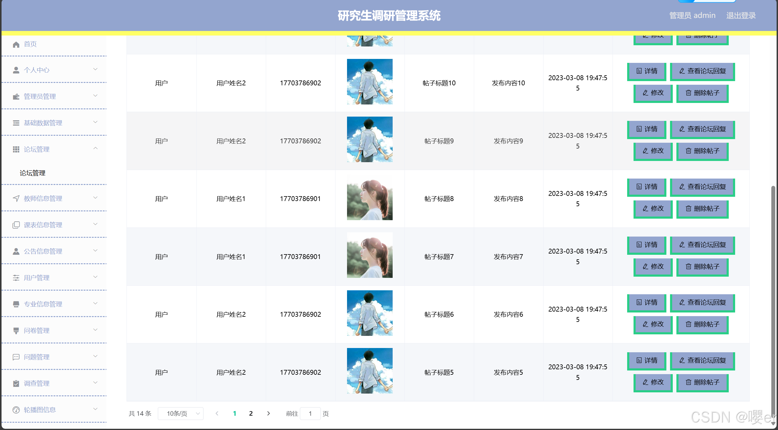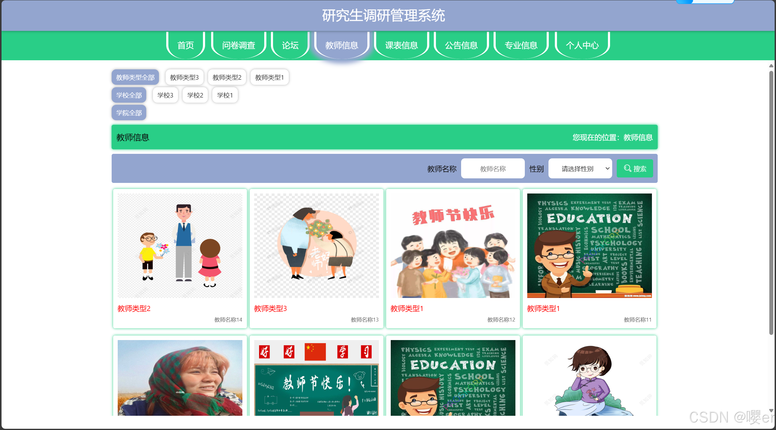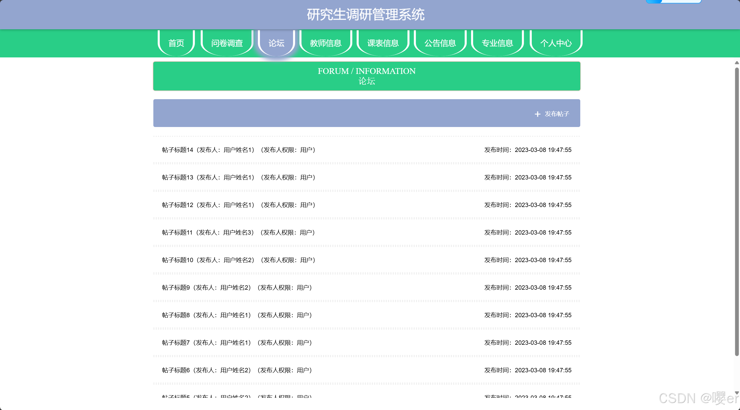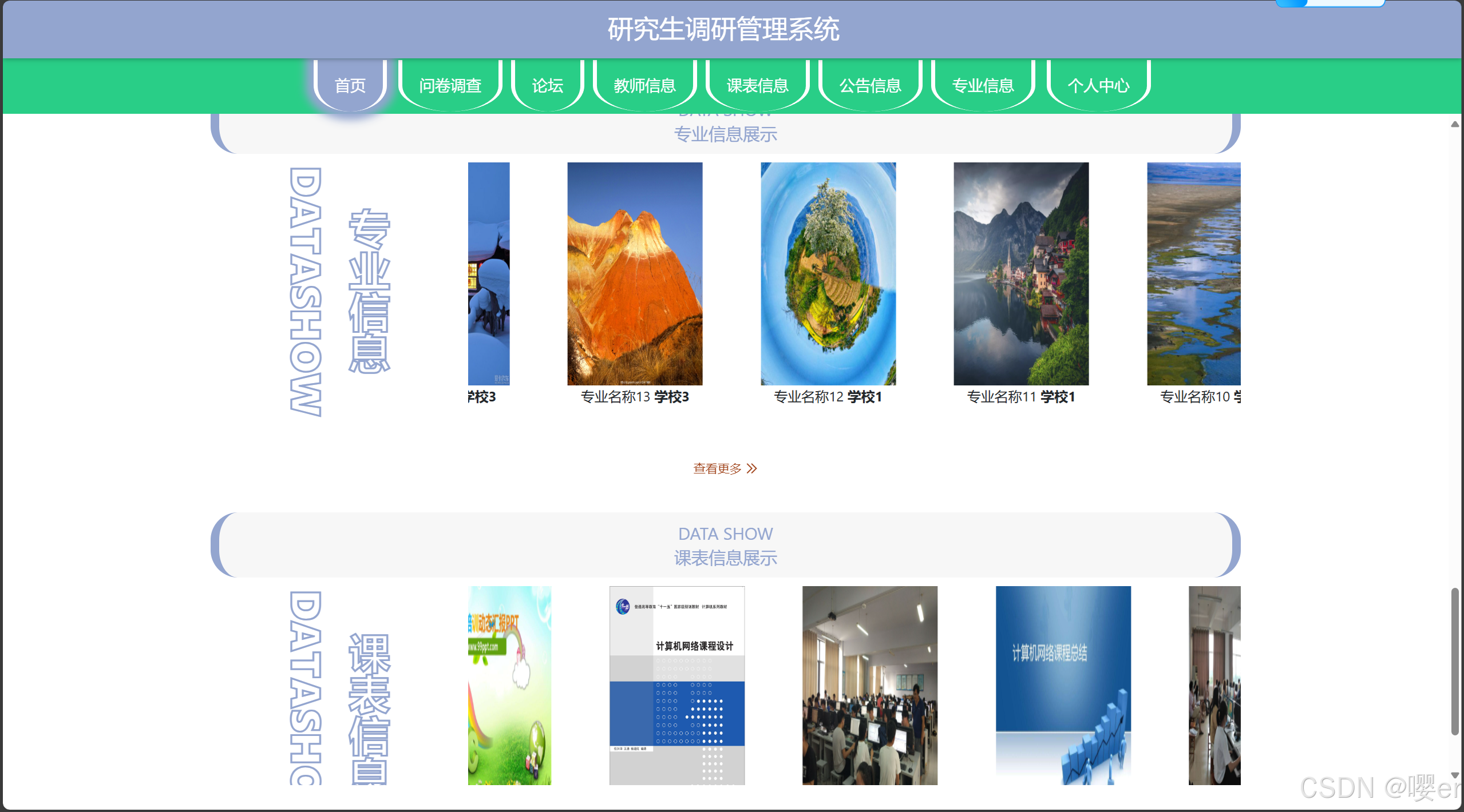 - 学生用户:可以访问首页,查看公告和教师信息,参与问卷调查,浏览论坛并发布讨论,查看课表和专业信息,管理个人资料。