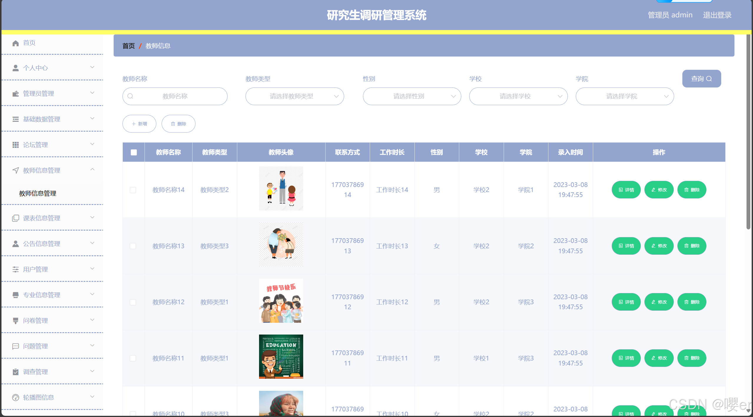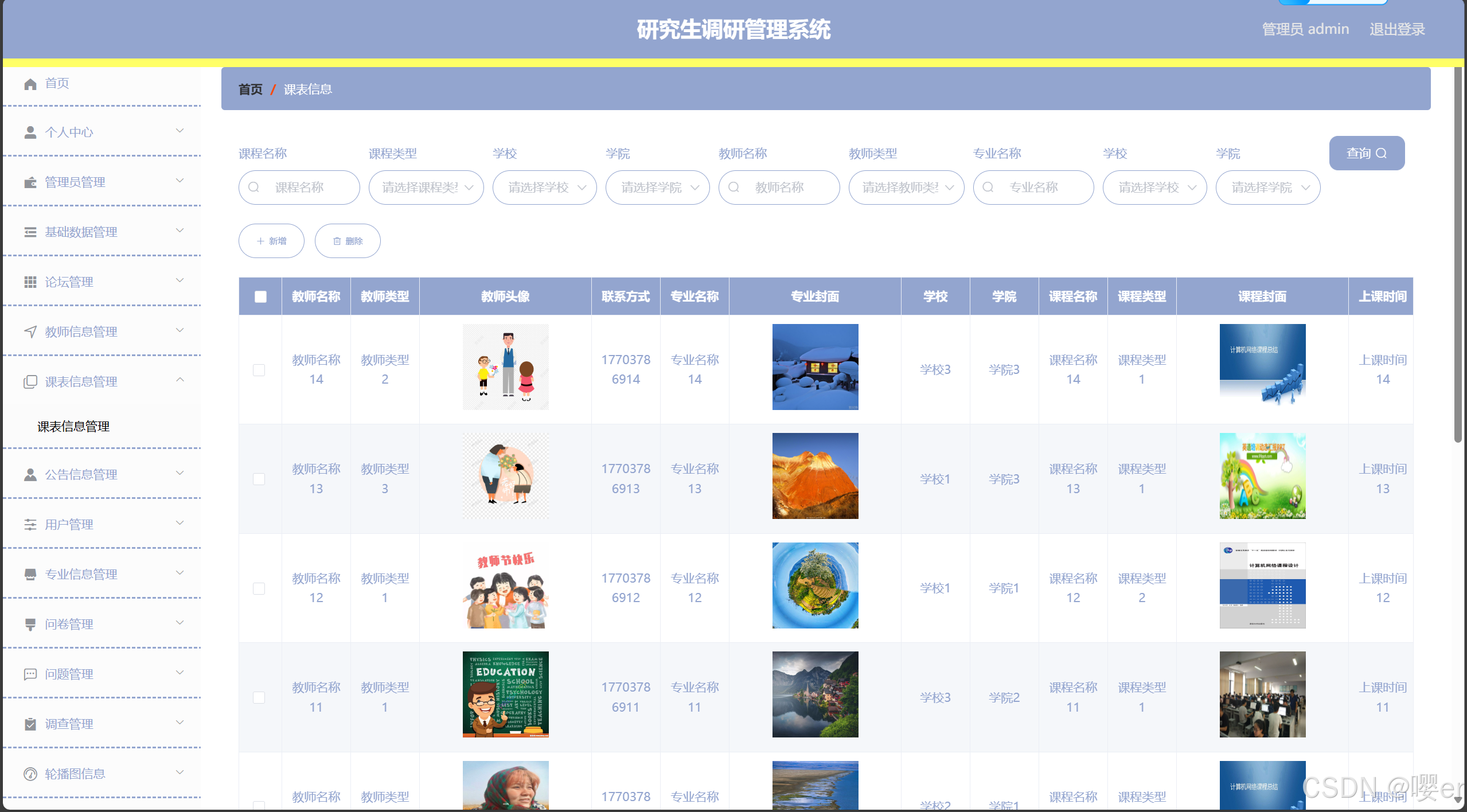- 管理员用户:具备更高级的管理权限,包括用户管理、教师和课表信息管理、论坛和公告管理、问卷与问题管理、基础信息管理等。