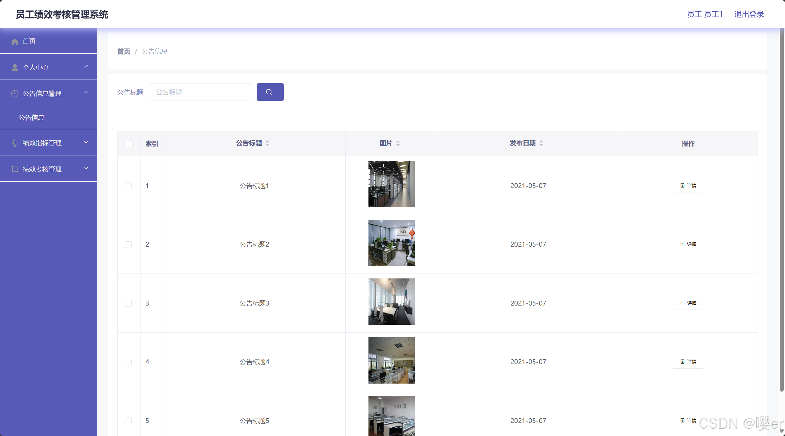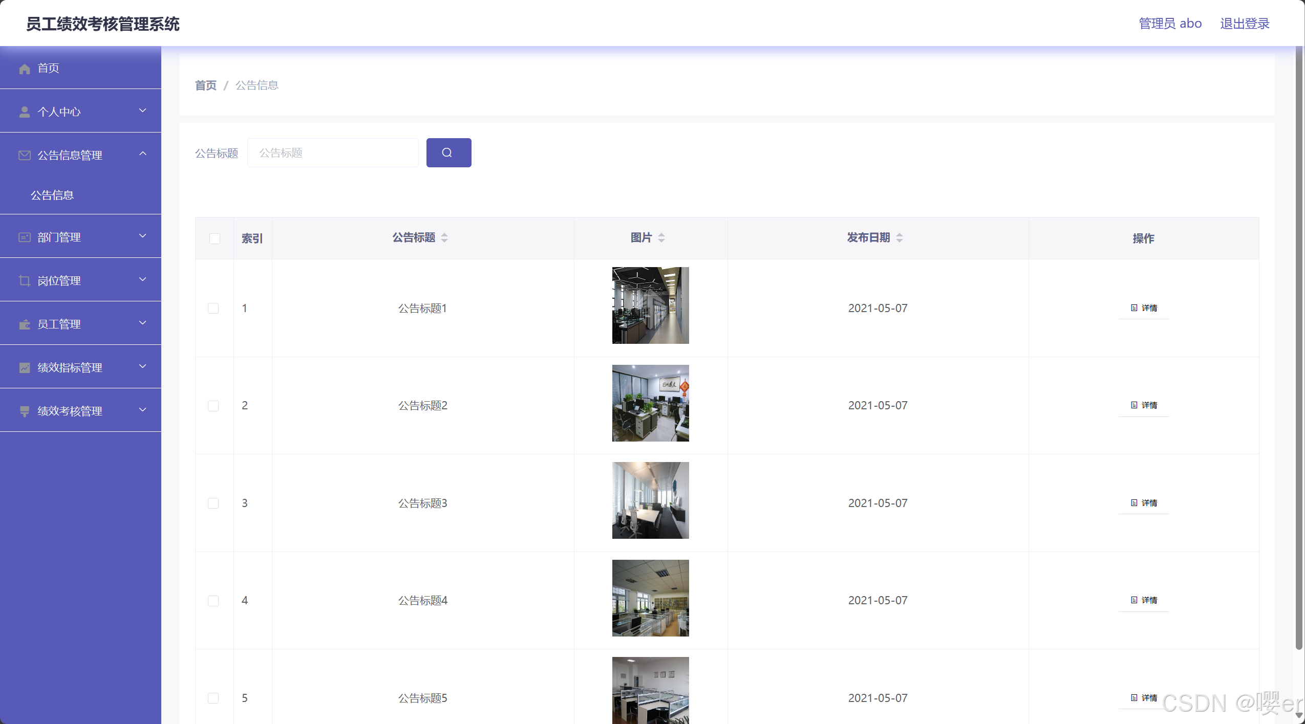 基于Spring Boot + Vue的员工绩效考核管理系统,旨在提高企业绩效管理的效率和透明度。系统分为员工端和管理员端两部分,员工端主要提供公告信息查看、绩效指标和考核结果查询功能;管理员端则提供公告管理、部门管理、岗位管理、员工管理、绩效指标和考核管理等功能模块。