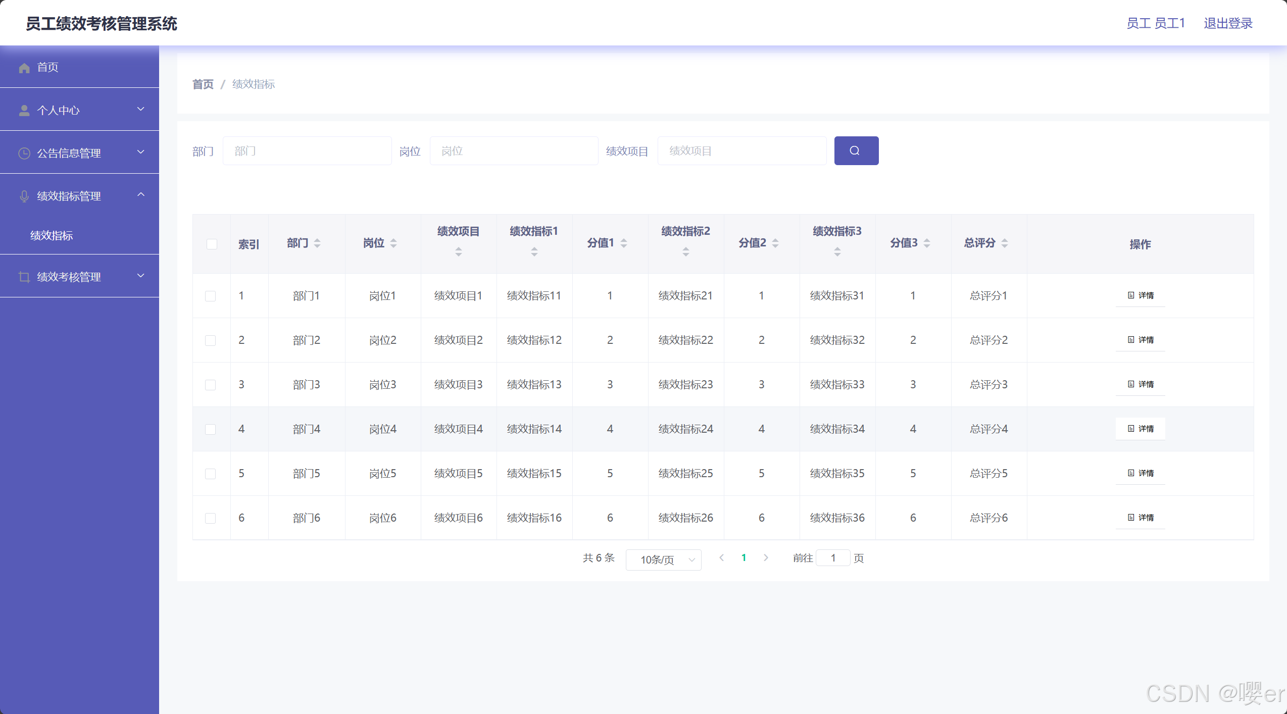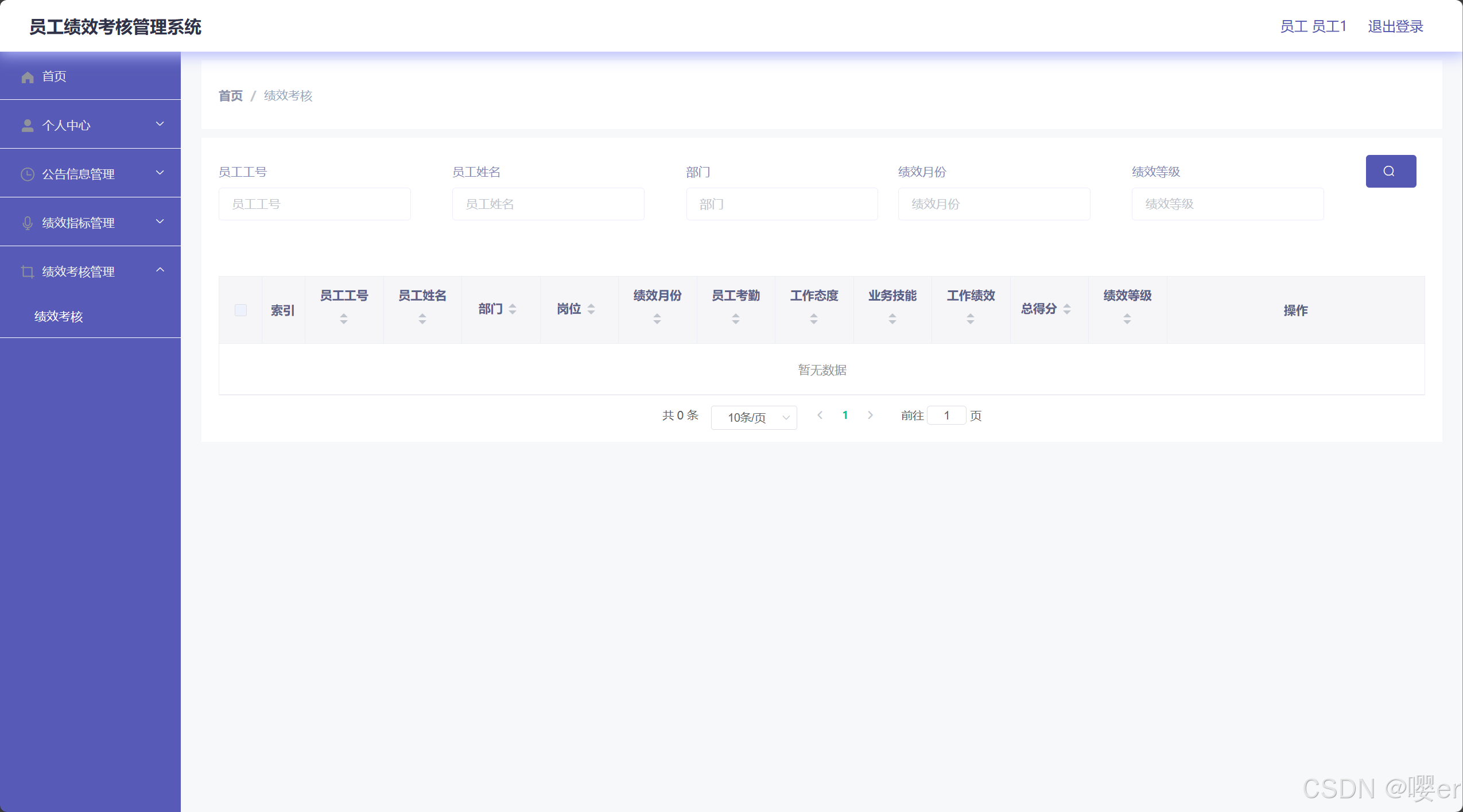 - 员工端功能:公告信息查看、绩效指标查看和绩效考核查询均运行正常,满足用户需求。