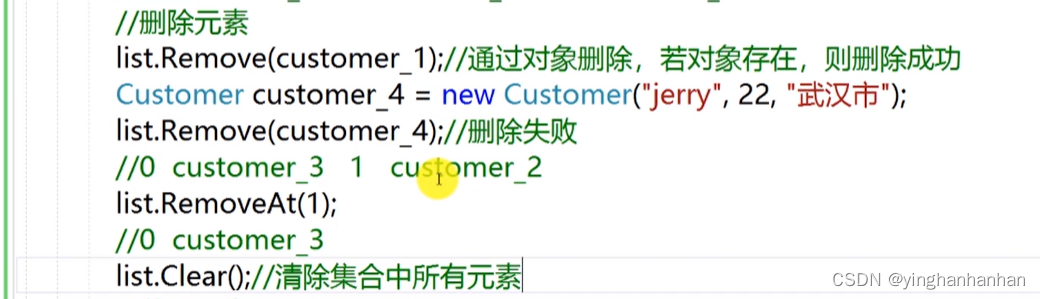 6.2.2删除元素:Remove(通过对象删除,对象存在,删除成功),RemoveAt(通过索引下标删除,list.RemoveAt(索引下标);),Clear(清空)