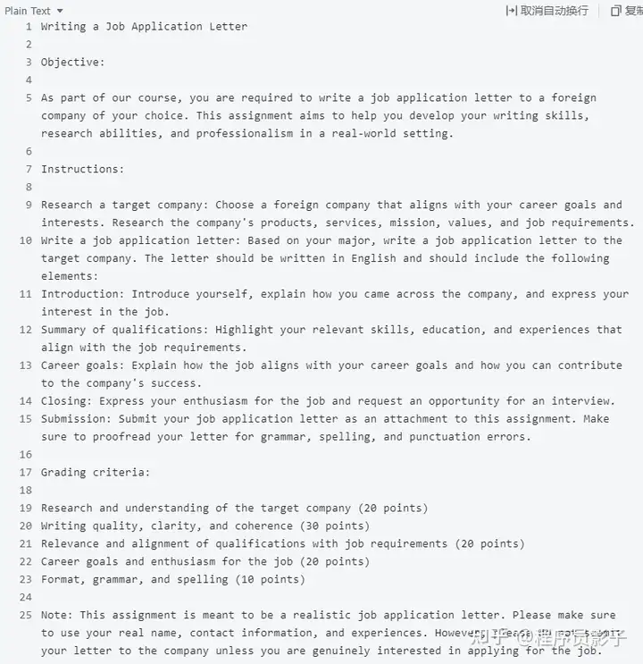 #背景信息:{Objective: As part of our course, you are required to write a job application letter to a foreign company of your choice.