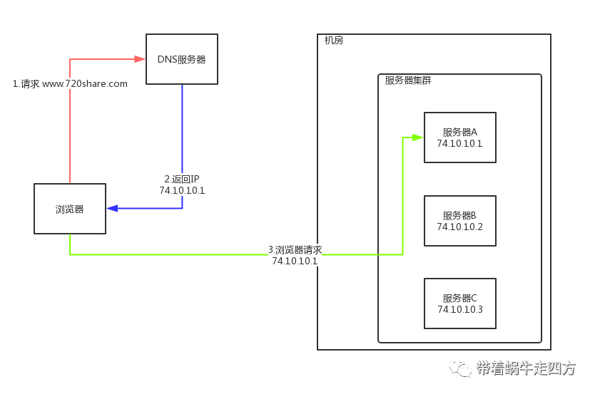 原理:在DNS服务器上配置多个域名对应IP的记录;例如域名:www.720share.com 对应一组服务器IP地址;域名解析时候经过DNS服务器的算法;将一个域名请求分配到合适的真实服务器上,利用了DNS服务器的解析;