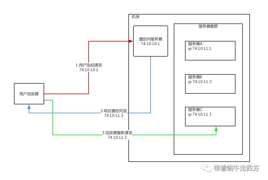 原理:根据HTTP请求计算出一个真实的服务器地址,并且将这个服务器地址写入HTTP重定向响应中返回给浏览器,浏览器再重新请求